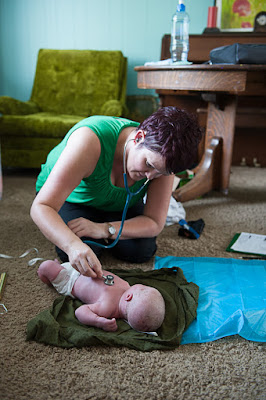The next time I gave birth this midwife who had delivered my daughter was on maternity leave. She agreed to still attend my birth (bringing her sweet baby and wearing him for much of my labor while still being a complete support to me) and be my doula. However once she got to the birth she ended up being the second attending midwife as I had my fourth baby at home. The midwife who had followed me through my pregnancy was a rock for me. She felt so confident I could deliver safely at home even with my rather dodgy delivery history. She gave me such peace of mind (even though I had been highly recommended a C Section by others) and she delivered my nine pound baby (my biggest baby by far) perfectly. It seemed like a miracle and really it was. The above picture is Cheryl filling out paperwork while everything in readiness for the birth is layed out on our dining room table that we had moved into the living room!